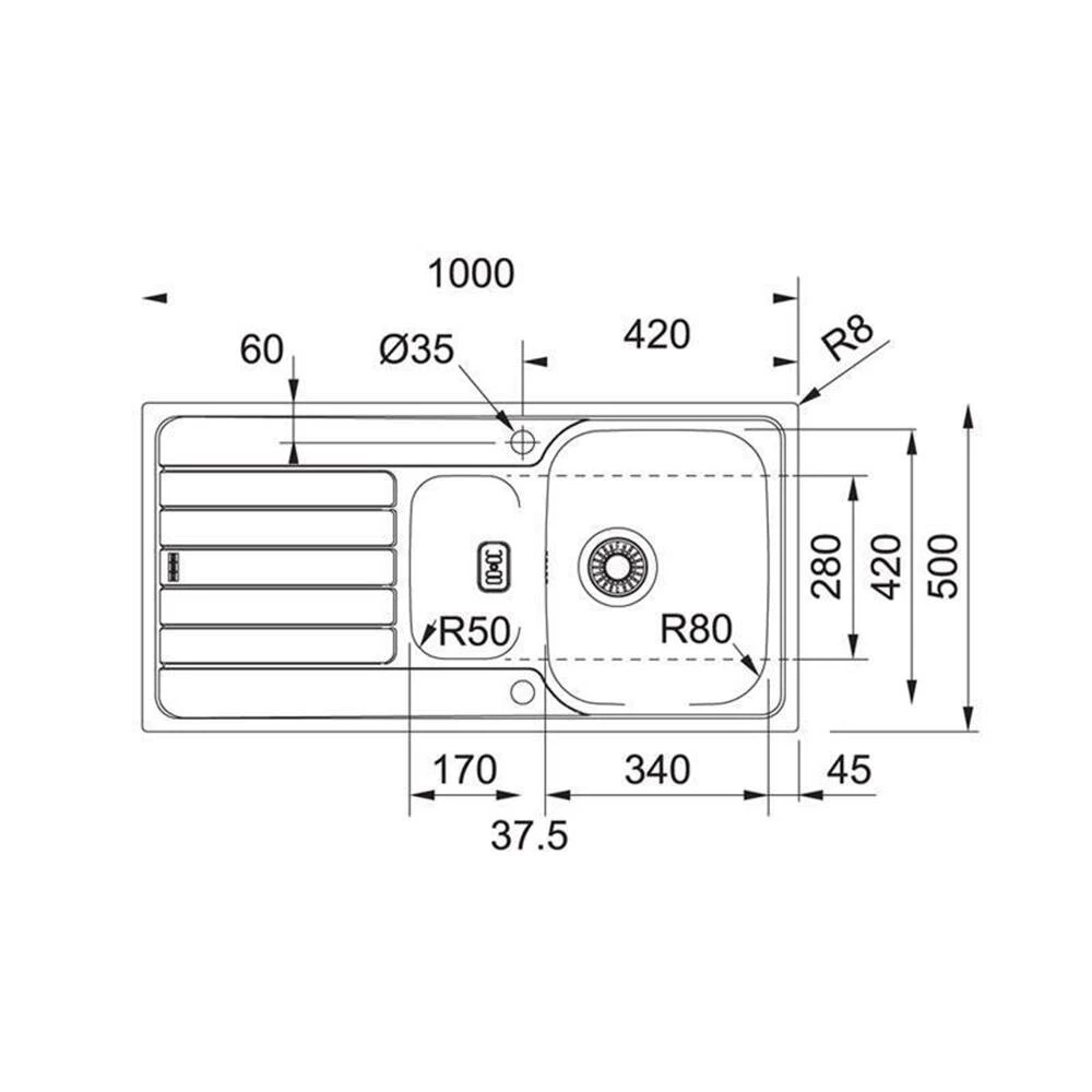 - Spülenmaß: B 1000 x T 500 mm