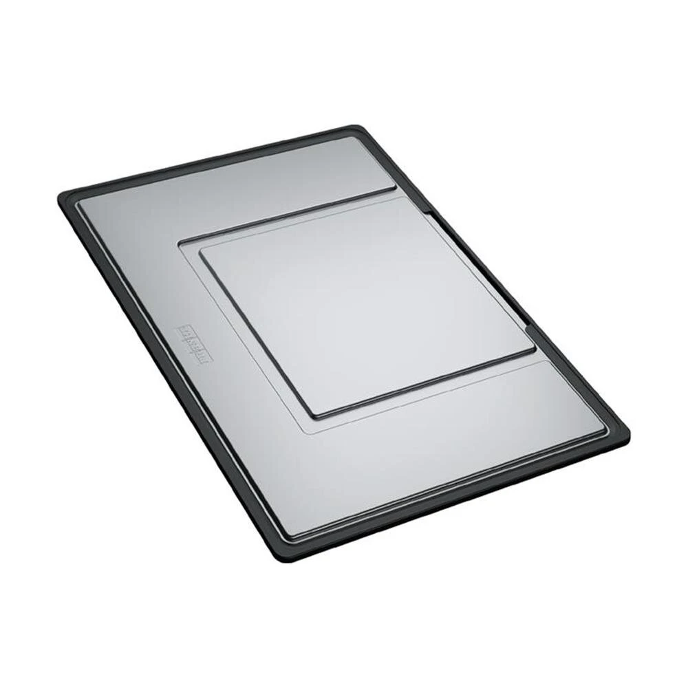 - Material: Edelstahl, ringsumlaufender Rand aus schwarzem Kunststoff